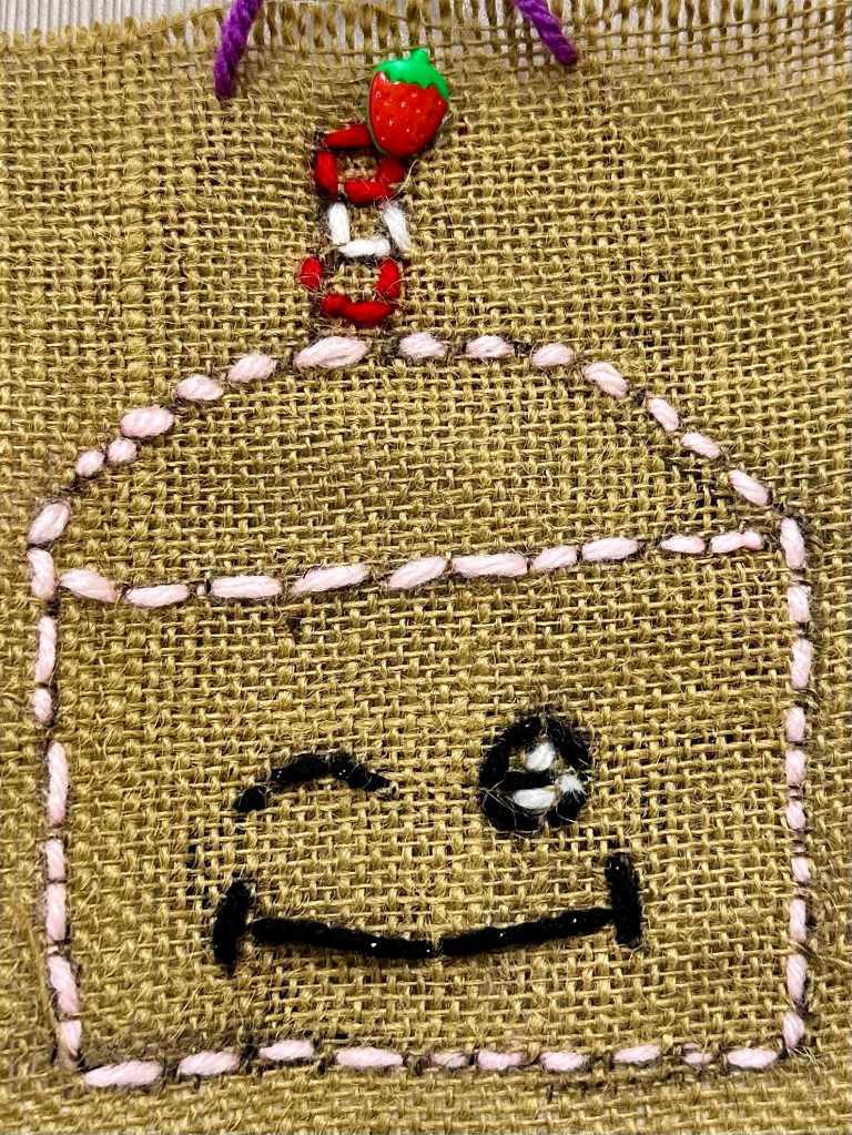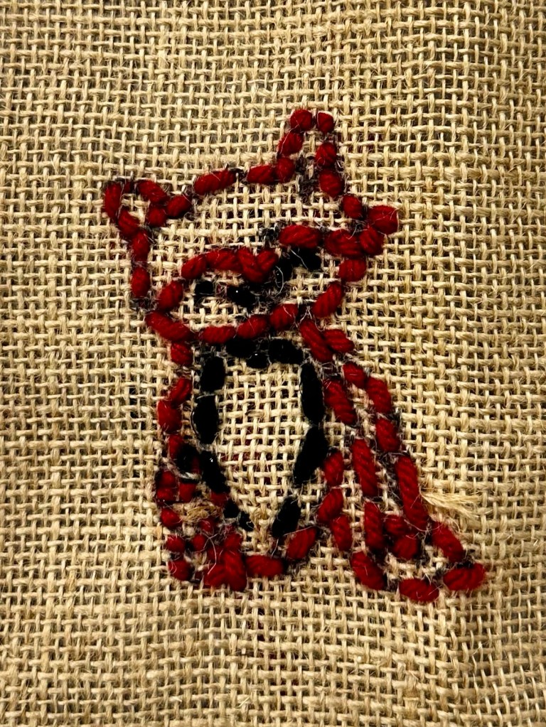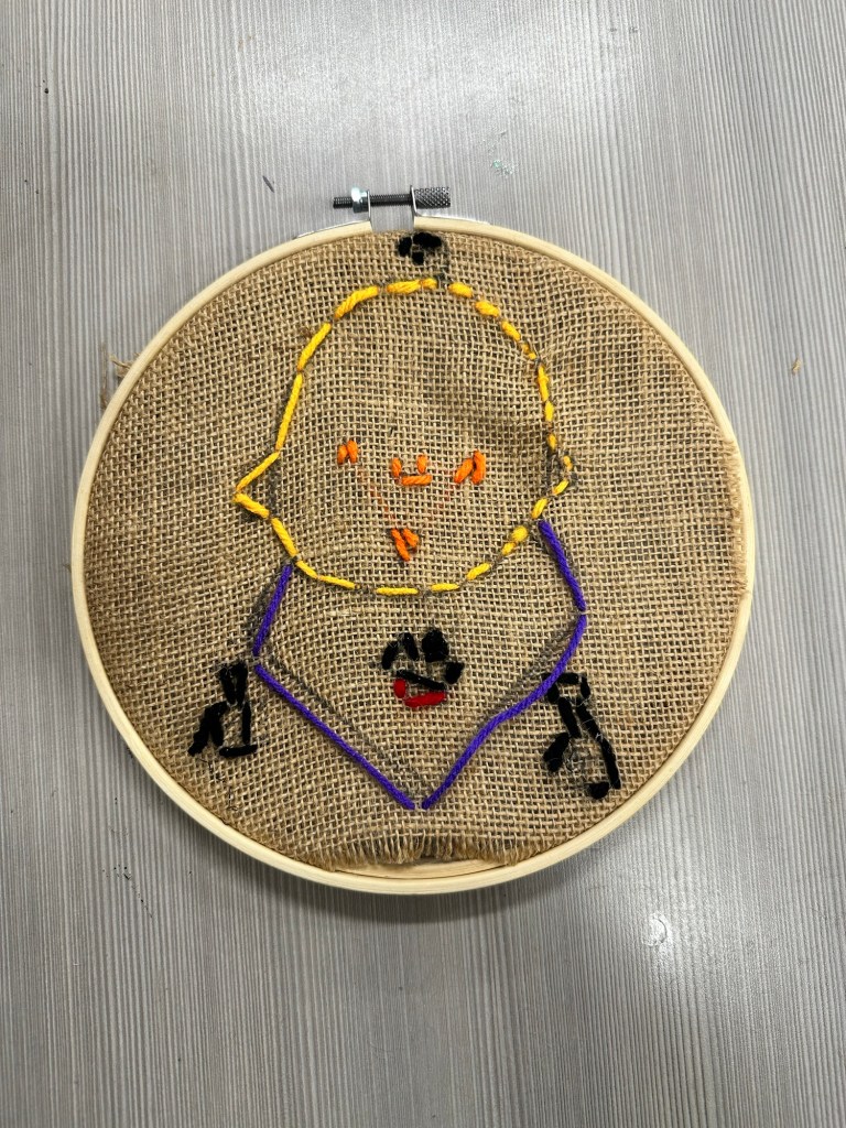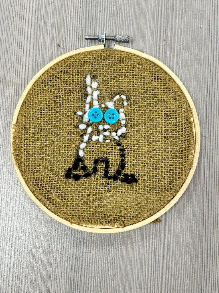 We sketched ideas on paper and drew them onto burlap with a black marker. They cut a piece of yarn and brought it to me to be knotted, threaded on their needle, and started from the back for the 1st stitch.
