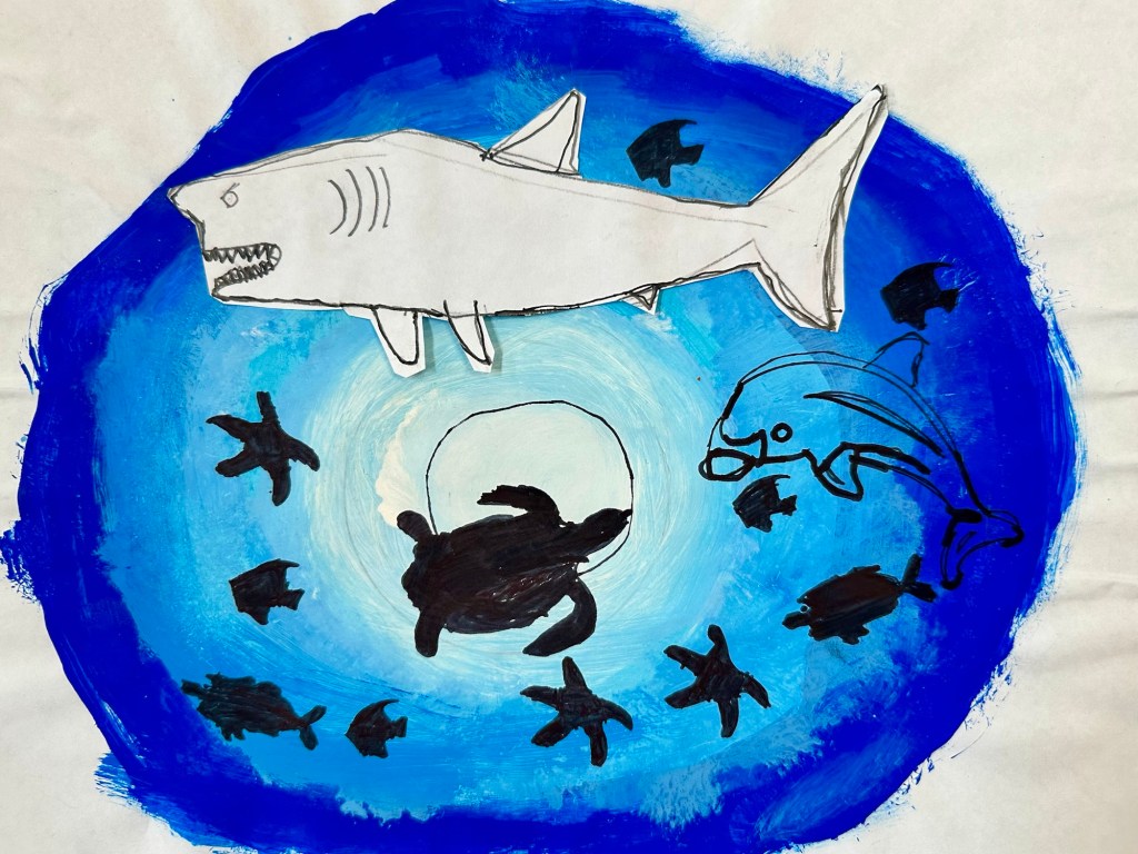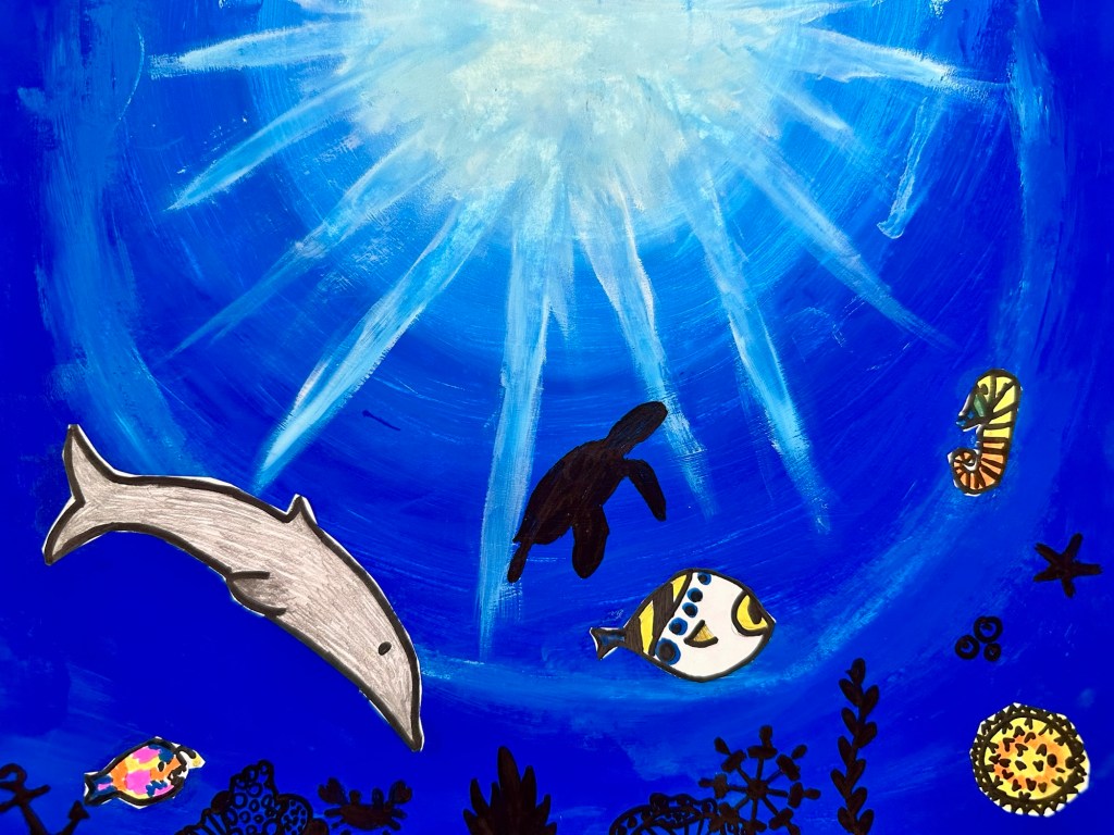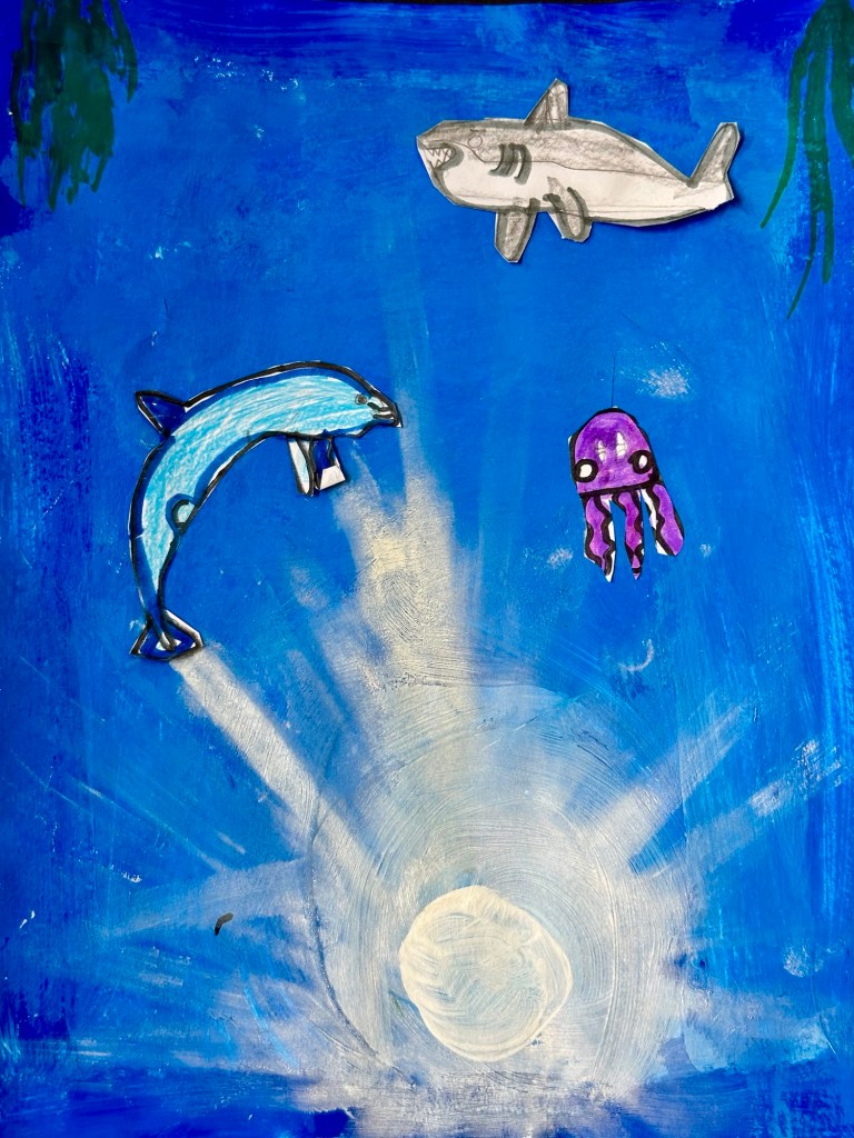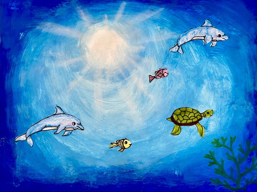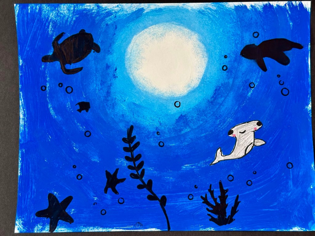 We blended our paint, draw an underwater animal with color, and added marine stenciled images as the finishing touch.