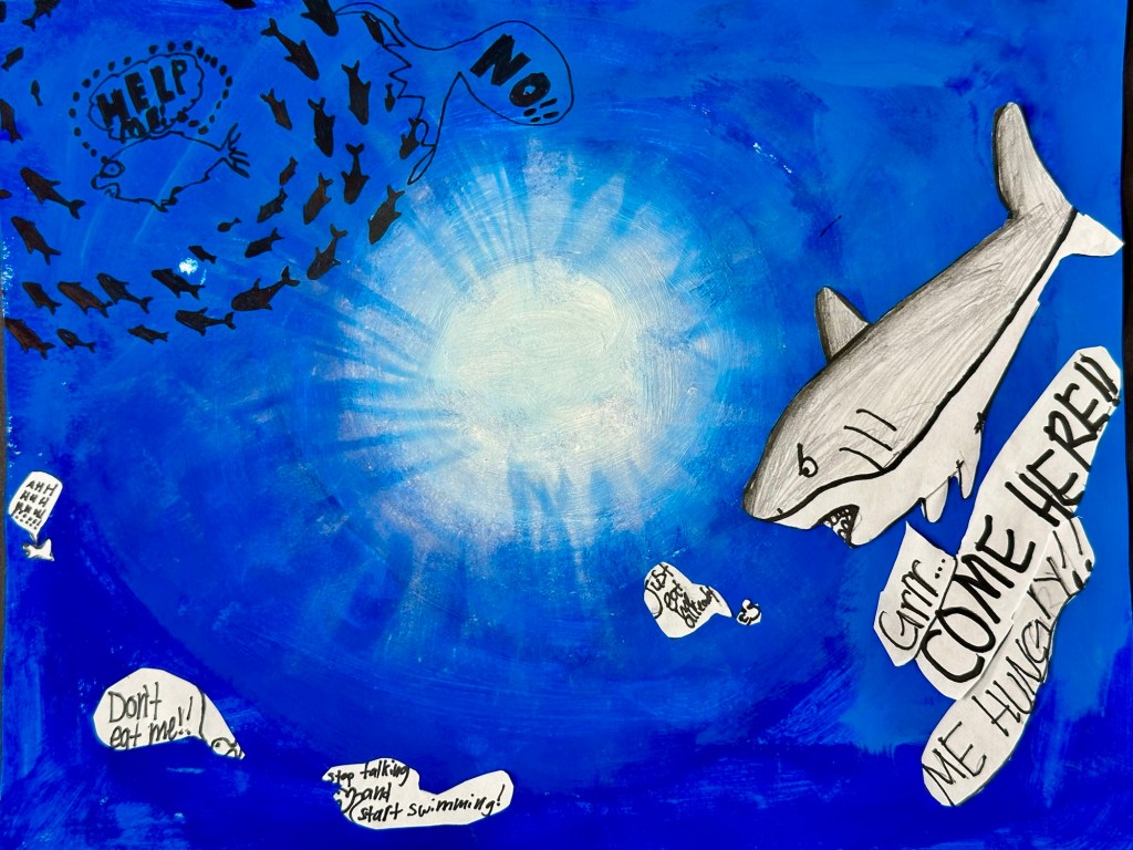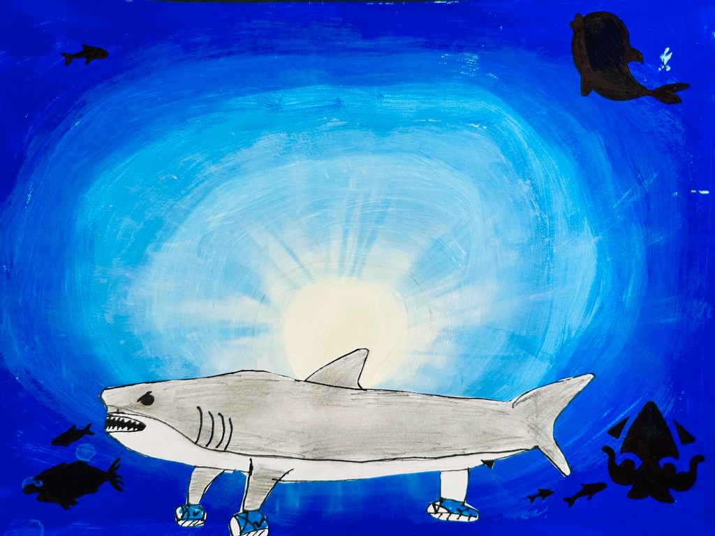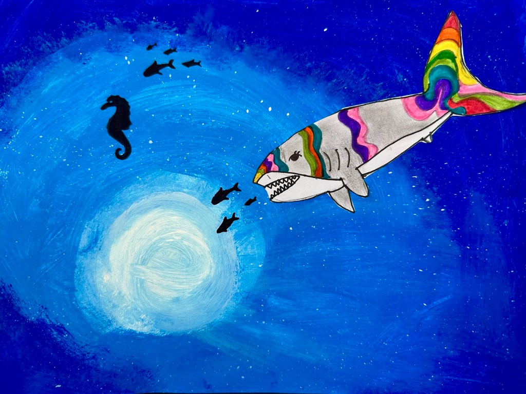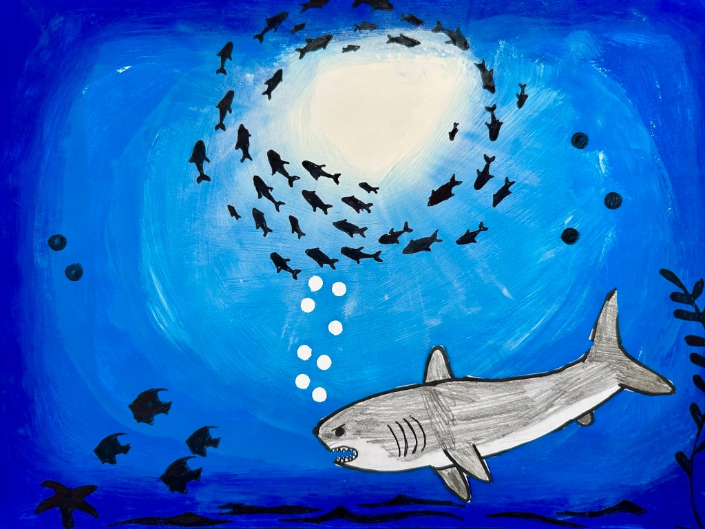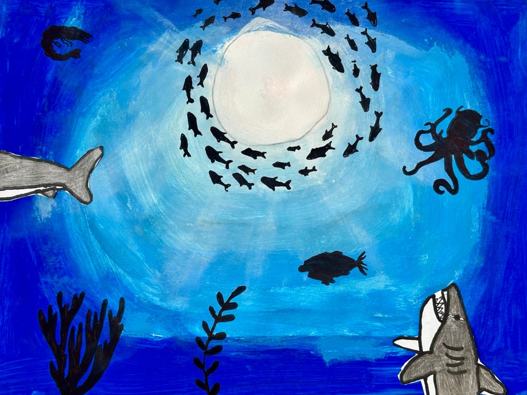 We blended our paint, draw an underwater animal with color, and added marine stenciled images as the finishing touch.