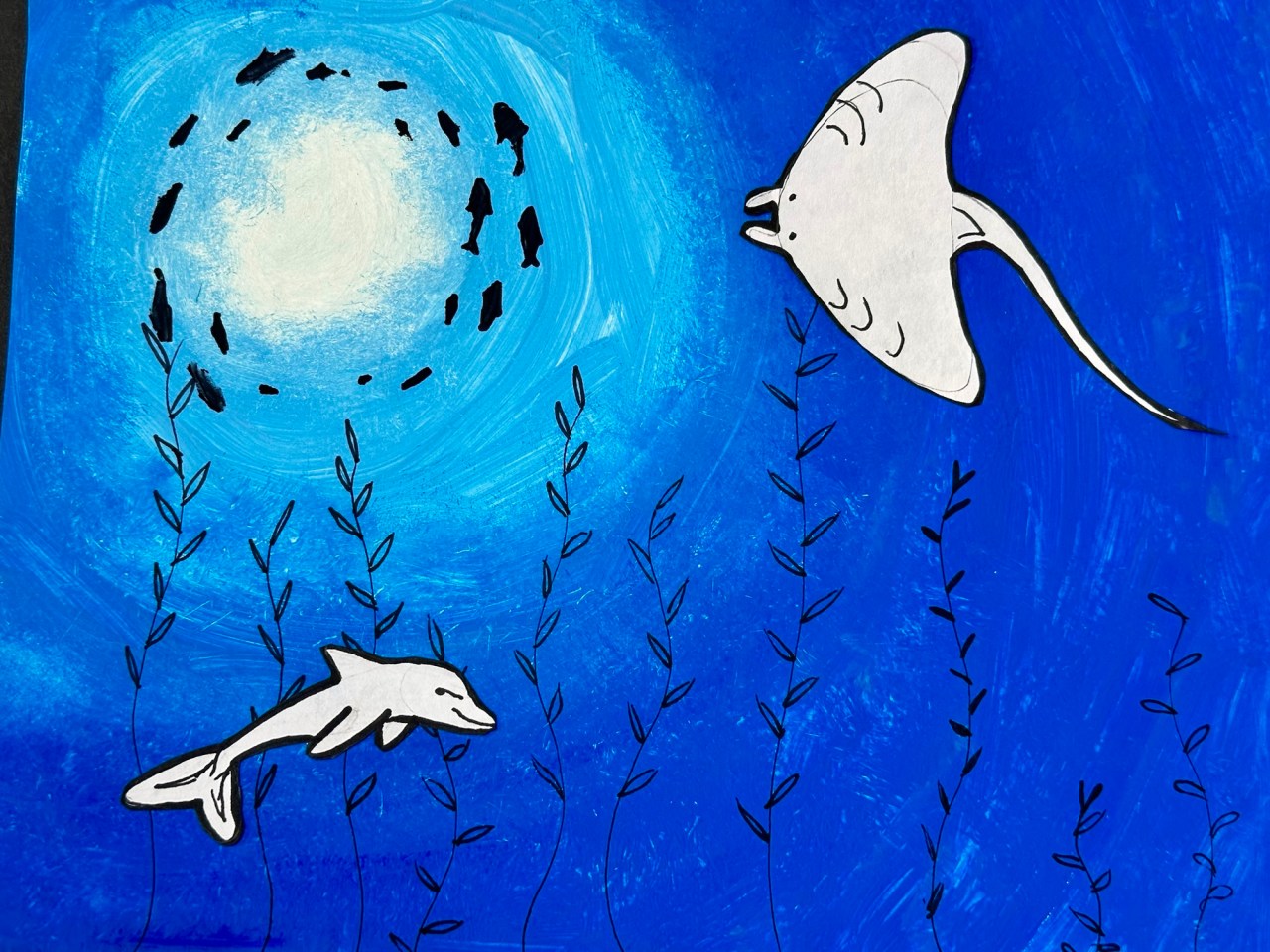 We blended our paint, draw an underwater animal with color, and added marine stenciled images as the finishing touch.